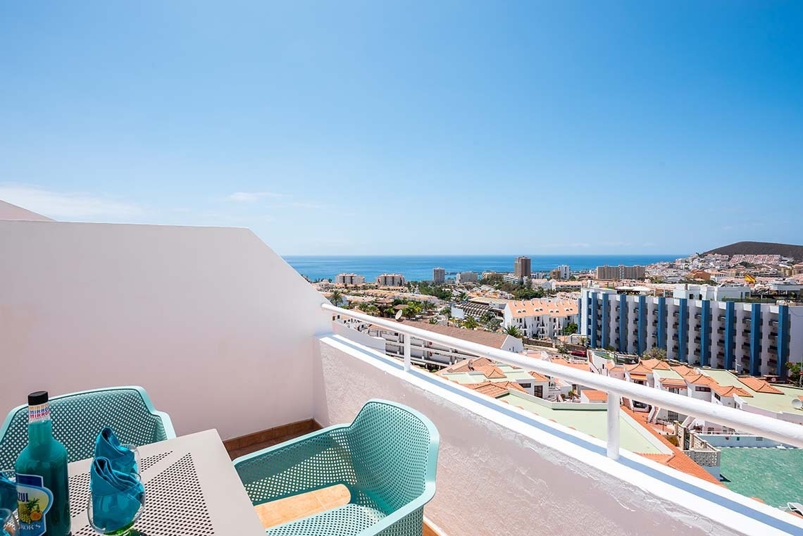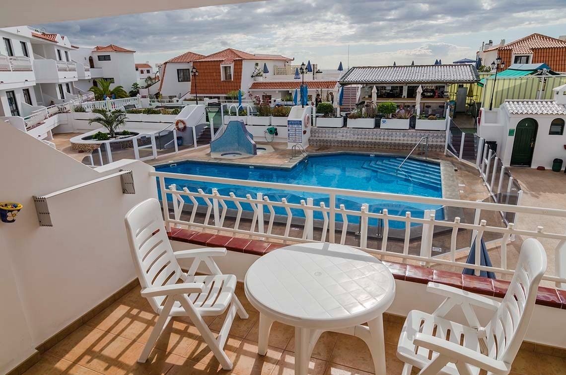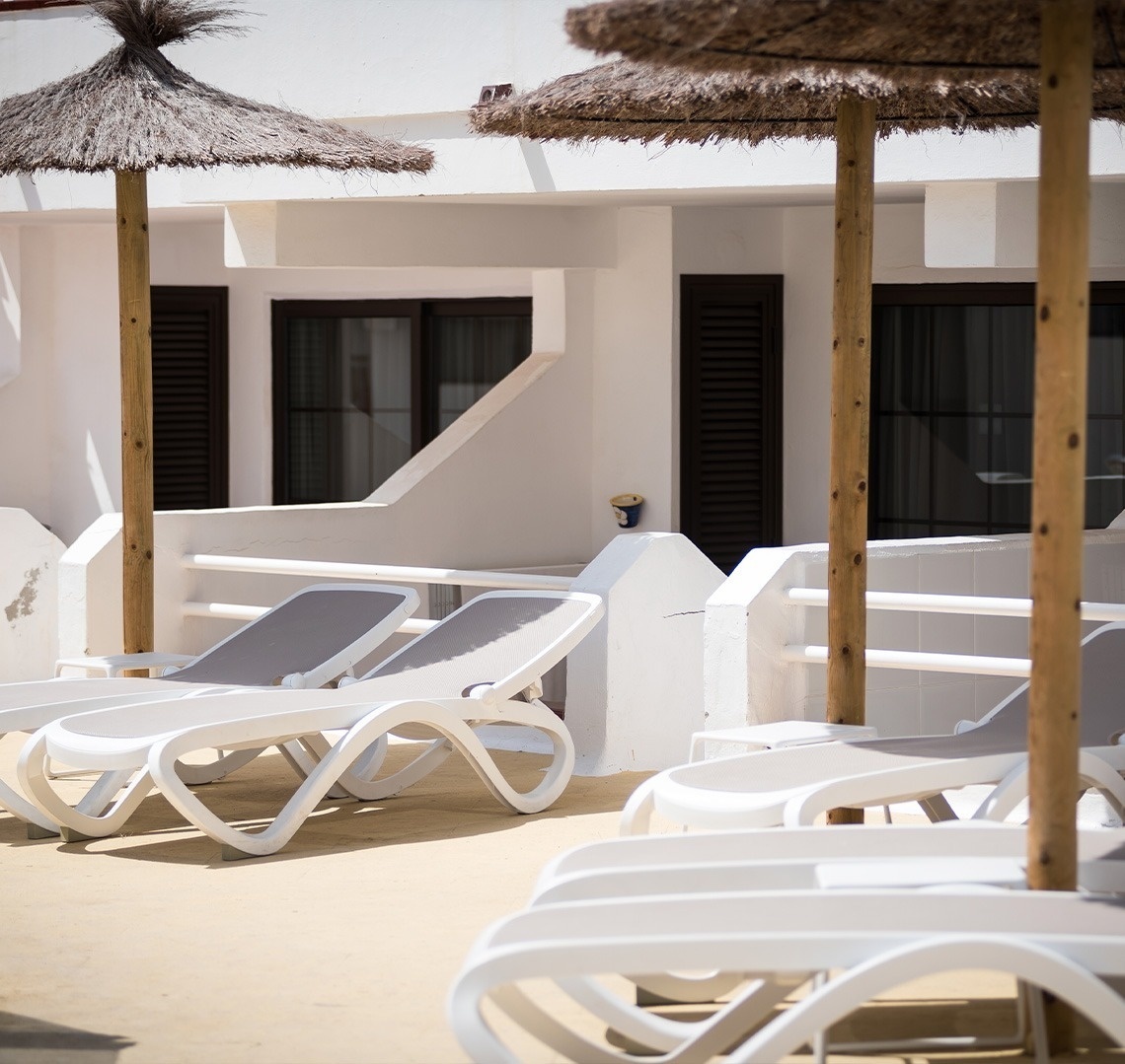 The duplexes have two sunny bedrooms, a private balcony with mountain views, and are fully equipped for long stays, accommodating up to six people. They consist of one bedroom with two single beds, another with a double bed and a sofa bed in the living room, a sun terrace, a private bathroom, and a fully equipped private kitchen. We also offer excellent Wi-Fi for teleworking, a pool bar, and a reception desk. All units have satellite TV with channels in English, Spanish, Italian, and French.