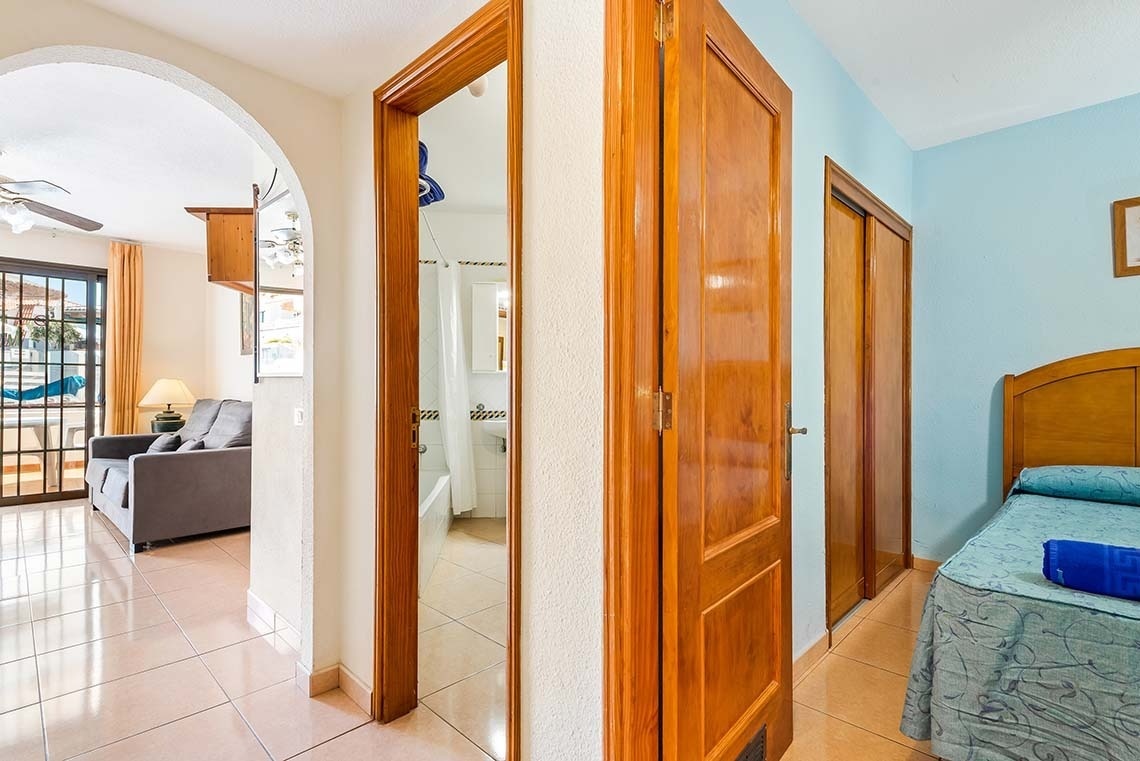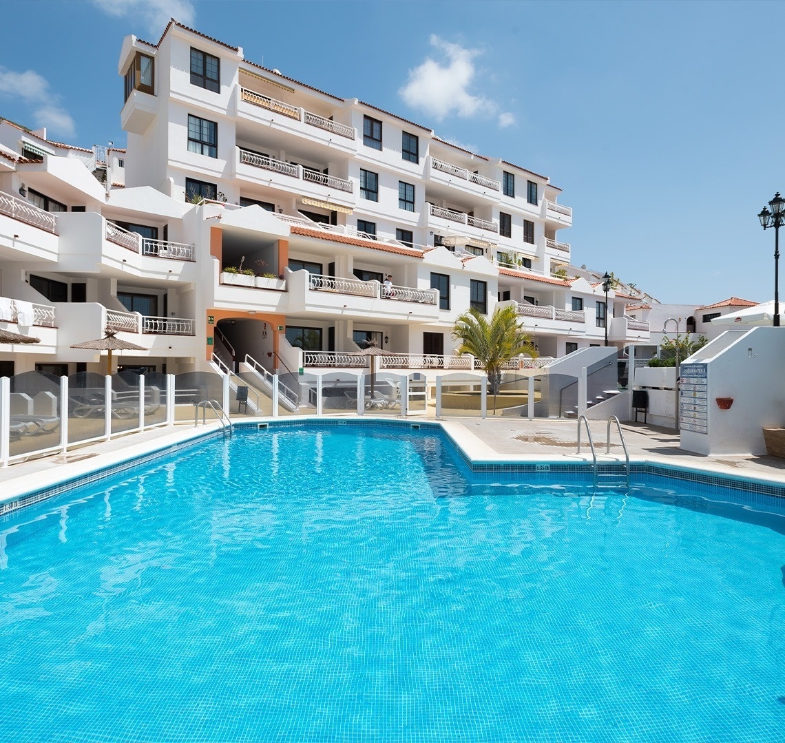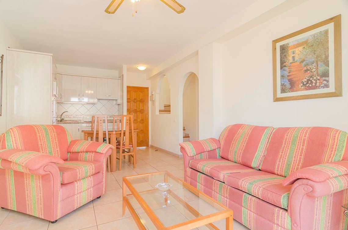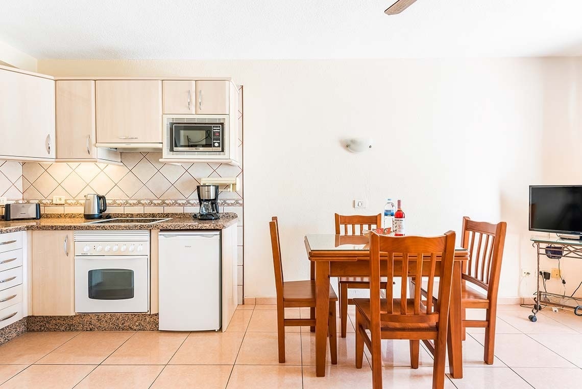 The duplexes have two sunny bedrooms, a private balcony with mountain views, and are fully equipped for long stays, accommodating up to six people. They consist of one bedroom with two single beds, another with a double bed and a sofa bed in the living room, a sun terrace, a private bathroom, and a fully equipped private kitchen. We also offer excellent Wi-Fi for teleworking, a pool bar, and a reception desk. All units have satellite TV with channels in English, Spanish, Italian, and French.